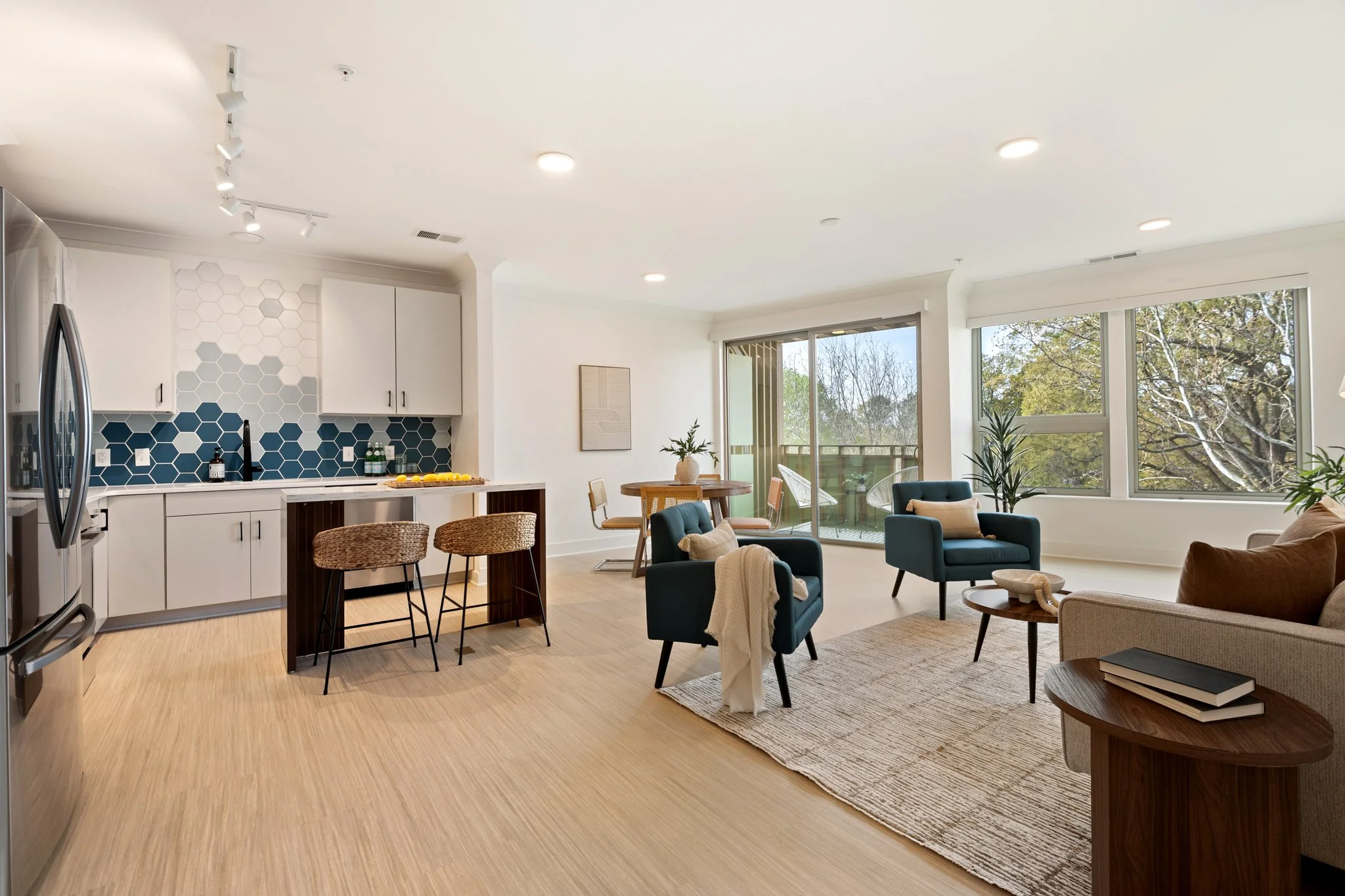The kitchen anchors the home with recycled glass countertops, KraftMaid cabinetry, and clean modern finishes, flowing into the main living and dining spaces. Fossilized bamboo flooring runs throughout, complemented by updated windows installed in 2018 and 2024.